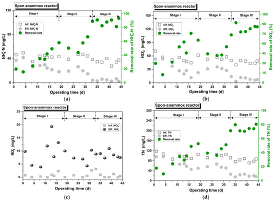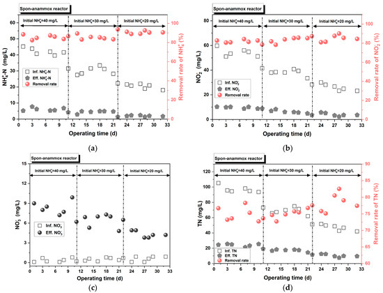 Figure 11. Treating performance of Spon-anammox reactor under different influent concentrations of COD, (a) NH 4 + - N ; (b) NO 2 ; (c) NO 3 ; (d) TN.