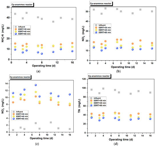 Figure 7. Treating performance of Cp-anammox reactor under different EBRT, (a) NH 4 + - N ; (b) NO 2 ; (c) NO 3 ; (d) TN.