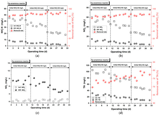 In Figure 9a, if the initial NH 4 + - N decreased from 40 mg/L to 20 mg/L, the NH 4 + - N removal efficiency achieved by the Cp-anammox reactor were 82.7 ± 1%, 86.6 ± 1.1%, 88.5 ± 2.2%, respectively. Concurrently, the consumption rate of NO 2 (Figure 9b) was 79.5 ± 2.3%, 82.6 ± 2.9%, 84.4 ± 1.9%, respectively. In addition, a proportional decrease in NO 3 accumulation was observed in Figure 9c. Correspondingly, the TN removal efficiency (Figure 9d) increased from 72.6 ± 1.4% to 77.0 ± 1.8%. When the initial NH 4 + - N was 30 mg/L, the effluent NH 4 + - N fluctuated between 3.9~5.2 mg/L. Upon further reduction of the initial NH 4 + - N to 20 mg/L, the effluent NH 4 + - N remained below 3 mg/L, which stably meets the class A requirement by the operation of 22 day.