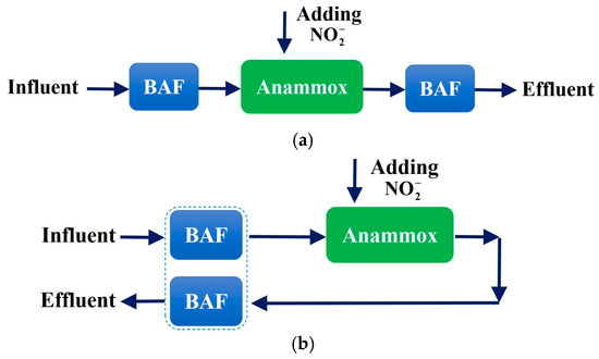 The increased supply of N to water and wastewater systems triggers a series of severe issues, wherein excess nutrient availability induces eutrophication, depletion of dissolved oxygen levels, and the emergence of black, odorous water [1,2]. The availability of efficient technologies for nitrogen removal in wastewater becomes imperative [3,4] and holds paramount significance in preserving the equilibrium and stability of aquatic ecosystems, as well as ensuring safe water quality. Conventional nitrogen removal techniques usually involve converting ammonia nitrogen ( NH 4 + - N ) to nitrate nitrogen ( NO 2 - N ), followed by denitrification to eliminate nitrogen, employing methods such as activated sludge treatment [5] or the biofilm method [6]. The biological aerated filter (BAF) is a prevalent form of the biofilm method. In wastewater treatment, BAFs have been applied in various contexts, including carbon removal, nitrification, and denitrification. BAFs primarily encompass two combined forms: pre-denitrification in the BAF process (DN-BAF) [7] and post-denitrification in the BAF process (BAF-DN) [8]. In the DN-BAF process, raw wastewater undergoes denitrification in an anoxic tank, where denitrifying bacteria utilize organic matter as a substrate to remove COD. Subsequently, the nitrification reaction takes place in the BAF unit, and the effluent nitrified liquid is partially refluxed into the DN unit for denitrification. When treating wastewater with a low C/N ratio, the utilization of carbon sources in the DN-BAF process is restricted to raw wastewater, resulting in unsatisfactory nitrogen removal performance and limited large-scale application [9]. In the BAF-DN process, COD removal and NH 4 + - N conversion occur in the BAF unit, while TN removal is achieved by adding an extra carbon source in the DN unit. The BAF-DN process does not involve nitrified liquid reflux, making it suitable for treating low C/N ratio sewage or for denitrifying high NH 4 + - N content wastewater. However, the BAF-DN process requires a significant amount of additional carbon sources, leading to high operating costs and the risk of COD exceeding the effluent standards. In recent years, the volume of sewage and pollutant content (especially nitrogen) in urban domestic wastewater has gradually increased in China [10]. On the premise of not adding an external carbon source or altering the original structural layout, enabling the BAF-DN process to meet the TN effluent requirements has become an engineering challenge to be addressed.