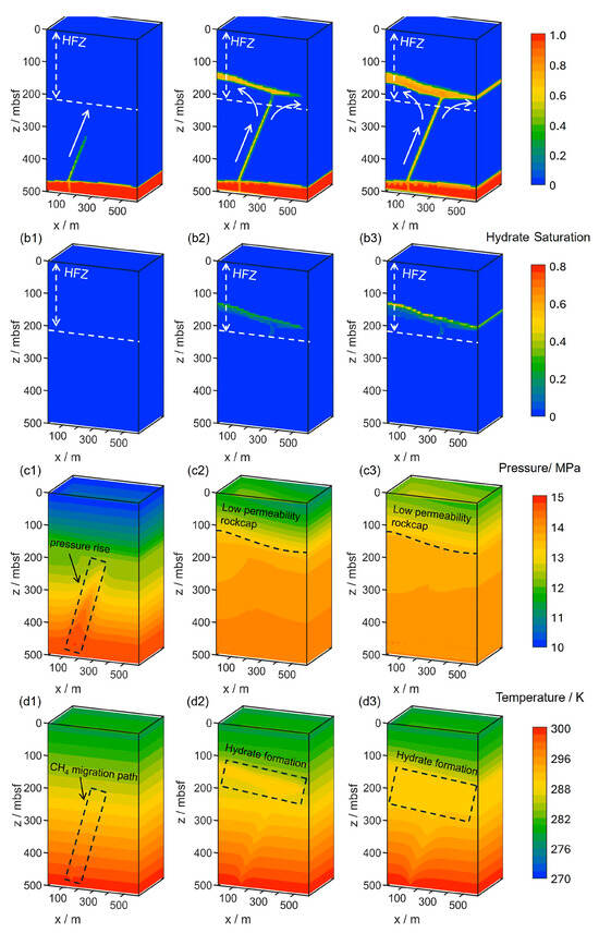 CH4 migration and hydrate formation primarily alter the environmental temperature and pressure conditions. Initially, significant pressure anomalies can be observed at the bottom gas source (Figure 2(c1–c3)). This overpressure is also the main driving force for the upward migration of deep gas sources. Subsequently, the vertical migration of CH4 increases pressure along the migration pathway, and the pressure increase along the pathway becomes more pronounced over time due to the continuous gas migration. When the CH4 reaches the cap layer, the cap layer restricts the vertical movement of gas, causing the CH4 to accumulate beneath the cap layer, where a notable pressure anomaly can be observed. However, as the CH4 combines with water to form denser hydrates, the volume of fluids in the pores decreases. The high pressure gradually dissipates, and the pressure distribution in the reservoir becomes more uniform. Additionally, the temperature of the sediments is influenced by the heat carried by migrating CH4, resulting in a noticeable temperature increase along the gas migration path. The formation of hydrates, which release heat, further raises the surrounding temperature, so the temperature distribution shows a shape similar to the distribution of hydrate formation (Figure 2(d1–d3)).