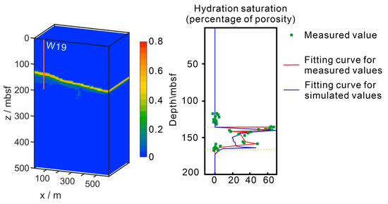 Final results of the hydrate saturation in the geologic model and comparison between the simulated and measured hydrate saturation values at W19.