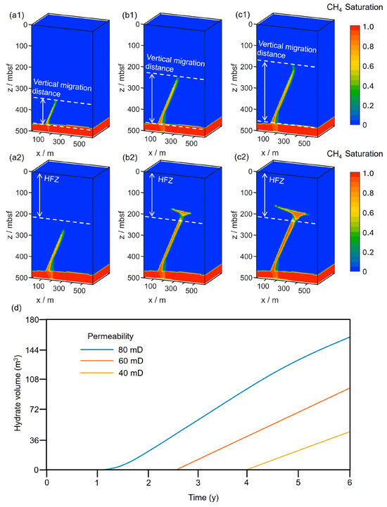 The fluid migration system composed of faults and other structures essentially acts as a high-permeability migration channel, where the internal permeability significantly impacts fluid migration. Therefore, in this section, all other model parameters were kept consistent with the base model, while the internal permeability of the fault was set to 80 mD, 60 mD, and 40 mD for the simulation. It can be clearly observed that as the permeability increased, the vertical migration speed of the CH4 accelerated (Figure 4(a1–c2)). When the permeability was 80 mD, the maximum vertical migration distance of the CH4 reached 300 m within 3 years; however, when the permeability was 40 mD, the maximum vertical migration distance of the CH4 was only 100 m within the same period. For every 20 mD increase in permeability, the vertical migration speed of the fluid increased by 100%. Once the CH4 migrates into the HFZ and reaches the appropriate temperature and pressure conditions for hydrate formation, it can react with water to form hydrates. Due to the decrease in the vertical migration speed of the CH4, the time it took to reach the HFZ was delayed. Therefore, when the permeability decreased, the time for hydrate formation was also correspondingly delayed. According to the simulation results (Figure 4d), when the permeability was 80 mD, hydrates began to form around 1 year after the simulation starts; when the permeability was 40 mD, hydrate formation started around 4 years into the simulation. This demonstrates that permeability can affect the timing of hydrate formation by influencing the fluid migration speed. Additionally, permeability has a certain impact on the final hydrate saturation. In reservoirs with lower permeability, CH4 migrates more slowly, allowing more time for it to fully react with water. Therefore, within the same time, if there is a continuous gas supply, hydrate layers with higher saturation can form in lower-permeability sediments.