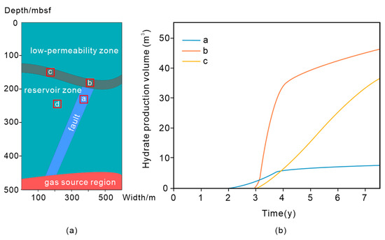 (a) Selection of regions with different fluid migration and aggregation conditions in the model ((a) good fluid migration conditions, poor aggregation conditions; (b) good fluid migration and aggregation conditions combined; (c) poor fluid migration conditions, good aggregation conditions; (d) both fluid migration and aggregation conditions are poor). (b) Evolution of hydrate generation rates in different regions.