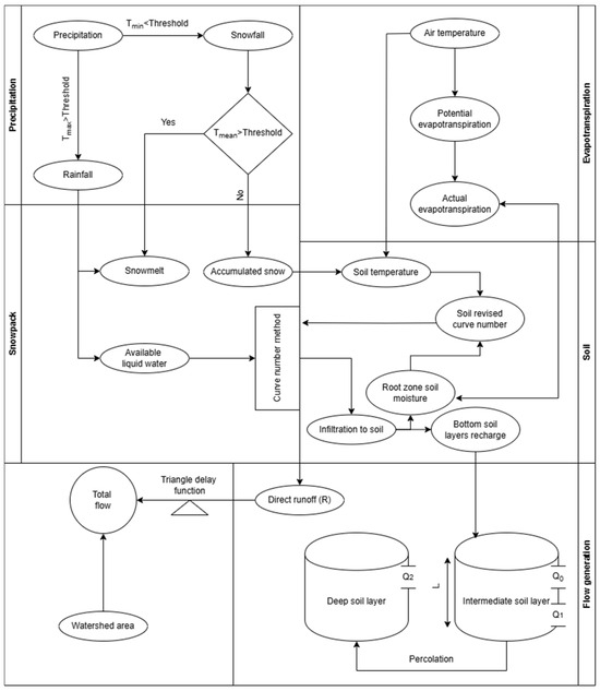 Conceptual HBV models are widely used for streamflow estimations at watershed outlets [79,80]. A variant of the HBV model was introduced by [81] based on [82], namely HBV-MTL. This model employs daily temperature and precipitation data as its primary inputs. It differentiates precipitation into the categories of rainfall, snowfall, or a mix of both, according to a temperature threshold. Rainfall and any resulting liquid water from melted snow may infiltrate the soil layer, contributing to soil moisture or surface runoff. The amount of the contribution split depends on the current soil temperature and moisture conditions.