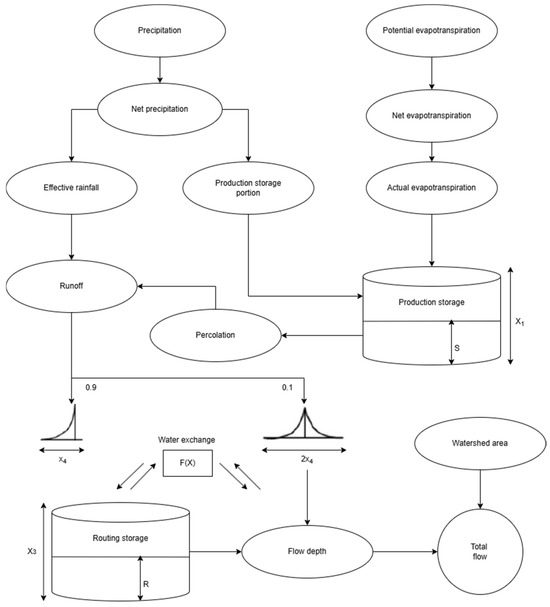 The GR4J model shown in Figure 3 is a numerical system that calculates runoff using daily data on precipitation, temperature, and potential evapotranspiration. Distinct from the HBV-MTL model, GR4J partitions the net precipitation, which is derived by deducting potential evapotranspiration from total precipitation, into two segments. This model comprises three primary components: production storage, routing storage, and dual unit hydrograph functions. Initially, a segment of net precipitation is allocated to production storage, where it percolates slowly based on soil moisture capacity. Concurrently, a portion of stored water facilitates evapotranspiration through vegetation usage. The remaining net precipitation merges with the water that percolated from the production storage and directed to the routing storage via unit hydrographs, which manage the delay between precipitation events and streamflow generation. At this juncture, 10% of the runoff is directly channelled to the outlet using a two-sided unit hydrograph. In contrast, the residual 90% is indirectly routed through interactions with groundwater, employing a one-sided unit hydrograph. Further information on the model’s architecture and equations is provided in [89].