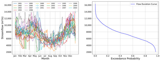Daily streamflow and the flow duration curve recorded at the Kisangani hydrometric station are presented in Figure 5. The left panel presents the daily streamflow recorded at the outlet for each year from 1981 to 2001, revealing interannual streamflow variations and peak periods that indicate seasonal influences. The right panel presents daily streamflow against exceedance probabilities over the same time period, as the river’s perennial characteristic. Low streamflow was recorded around 5000 m3/s, medium flow at approximately 7500 m3/s, and high flow above 11,000 m3/s.