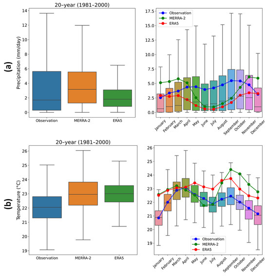 The right panels of Figure 6 highlight seasonal variations, presenting daily precipitation and temperature boxplots for each month. Observation unveiled two high precipitation periods during March-April-May (MAM) and September-October-November (SON), with peaks in April and November exceeding 12 mm/day. MERRA-2 unveiled a lower variability and magnitude in precipitation compared to observed data, with peaks in March, and ERA5 consistently recorded lower precipitation values and less variability throughout the year. For temperature, observation indicated a distinct seasonal cycle, with temperatures peaking in March and April (over 23 °C) and the coolest period from June to August (around 21 °C). MERRA-2 captured the seasonal cycle well, generally indicating slightly higher temperatures than gauge observations, while ERA5 followed the observed seasonal cycle but reported consistently higher temperatures.