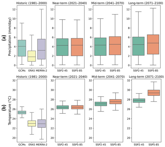 Although there were slight increases in variability, a similar median was projected by SSP5-85 with maximum and minimum daily temperatures of 28 °C and 25 °C, respectively. The mid-term projections under SSP2-45 maintained a mean daily temperature of 27 °C, IQR from 26.7 °C to 27.5 °C, and a maximum and minimum temperature of 28.8 °C and 25.4 °C. Temperature patterns remained similar under SSP5-85, with a mean of 27.6 °C, IQR that was slightly broader, and a maximum and minimum temperature of 29.9 °C and 25.7. The mean daily temperature under SSP2-45 for the long term was 27.8 °C, and the IQR ranged from 27.4 °C to 28.2 °C. A considerable increase was noticed under SSP5-85 that projected a mean daily temperature of 29.4 °C, IQR from 28.8 °C to 30 °C, and maximum and minimum reaching 32 °C and 27.6 °C, respectively.