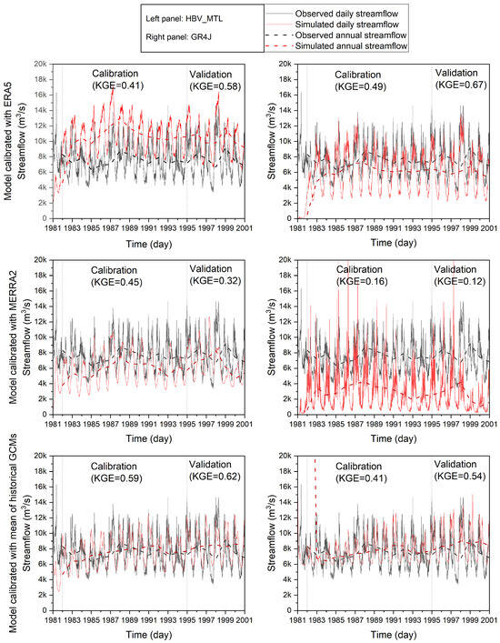 The calibration and validation periods are clearly outlined in Figure 8, with Kling–Gupta efficiency (KGE) values providing a quantitative measure of model performance. Distinct patterns emerged in the performance of the HBV-MTL and GR4J models during the calibration and validation stages. When utilizing ERA5 reanalysis data for calibration, the HBV-MTL model tends to overestimate observed streamflow. Conversely, under the ERA5 configuration, the GR4J model generally underestimates observed streamflow. With MERRA-2 configuration, both the HBV-MTL and GR4J models tend to underestimate the observed streamflow. This consistent underestimation hints at biases in MERRA-2 data or shortcomings in representing certain hydrological processes within these models using this dataset. When the hydrological models were calibrated with historical GCMs, they exhibited an alignment with the observed streamflow. This alignment suggests that the models can effectively reproduce the patterns when historical GCM data are utilized, highlighting the potential of these models to serve as tools for simulating streamflow under past climate conditions. In general, the results of calibration and validation emphasize the varying performance of the HBV-MTL and GR4J models based on the input data.