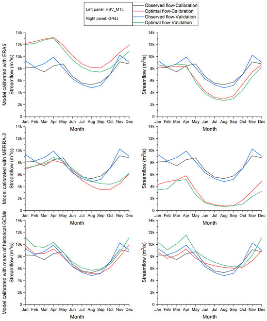 The long-term historical annual runoff shown in Figure 9 presents observed flow (solid black line), optimal flow for calibration (solid green line), observed flow for validation (solid blue line), and optimal flow for validation (solid red line). Across configurations, both hydrological models captured fluctuations in streamflow, including high- and low-flow periods, as well as the seasonality. Generally, the ERA5 configuration aligned well with gauge observations for both hydrological models, particularly during the calibration period. Notably, this alignment reflects high-flow periods from March to May and September to November and low-flows period from June to August. Discrepancies were more pronounced in the MERRA-2-based models, especially concerning the HBV-MTL model during low-flow months from June to August. The historical GCM-based models showed good performance by representing seasonal changes and closely matching the observed and simulated streamflow. The findings underscore the significance of choosing input data for modelling. The ERA5 configurations seemed effective for both the HBV-MTL and GR4J models, whereas adjustments may be required for the MERRA-2 configurations to better capture low-flow periods. The historical GCM-based models present a viable option for capturing long-term seasonal variations in streamflow.
