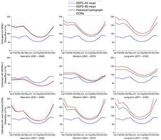 ERA5-based models revealed a general increase in annual discharge under SSP2-45 and SSP5-85 compared to the long-term historical hydrograph across all future horizons. GCM-based models also displayed an increase in discharge across future time periods. MERRA-2-based models showed a decline in discharge compared to the long-term historical hydrograph for the near future, followed by an increase in the mid- to long-term future.