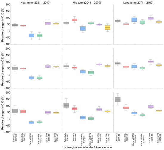 For the GR4J models configured with ERA5, as depicted in Figure S3, there was a clear pattern where the low flow (Q10) was projected to decrease across all future horizons. In contrast, both the mid flow (Q50) and high flow (Q90) were projected to increase. This potential shift in variability could imply more pronounced extreme runoff events. GR4J models that were configured with MERRA-2 projected a decrease in annual flow quantiles Q10, Q50, and Q90 throughout future horizons. Models configured with historical GCMs, however, projected a considerable increase in Q10, Q50, and Q9. The increase was observed particularly during the near term (2021–2040).