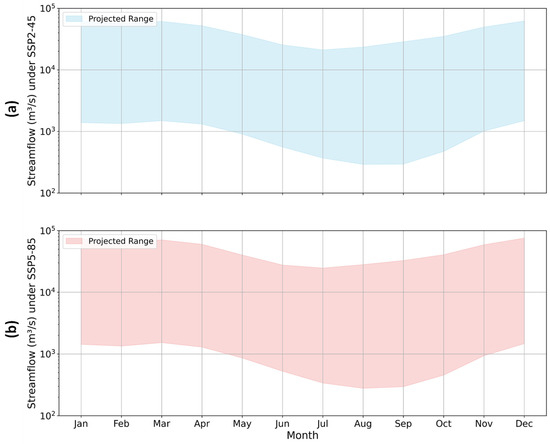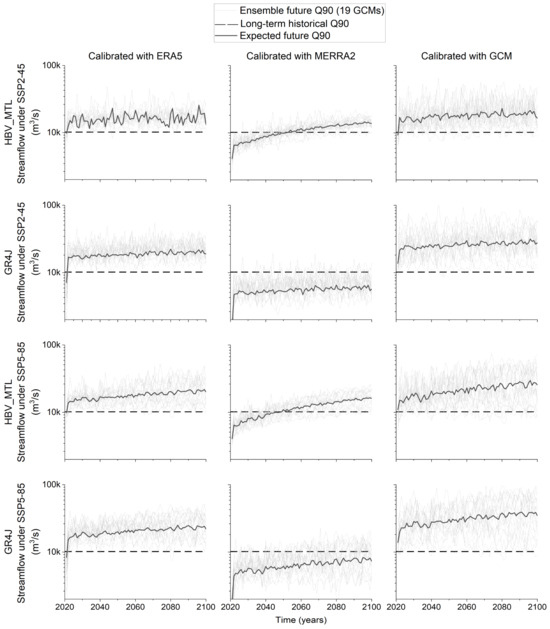 Streamflow values were averaged over the historical period to calculate the long-term historical interannual quantiles. Similarly, based on the outputs of the SSP2-45 and SSP5-85 scenarios, with an ensemble of 19 GCMs, the long-term projected interannual quantiles were calculated for six hydrological model configurations.