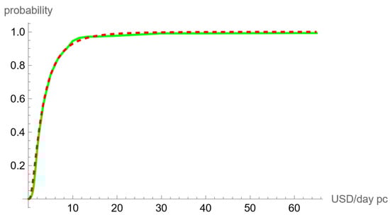 Next, we estimated the fraction of persons (among the considered 1131 persons) with incomes below the poverty line. Here, we studied the distribution of daily per capita incomes across the population. Figure 1 plots their cumulative distribution functions. The average of the midpoints of the modified individual income intervals was 4.15 USD/day per person. Again, we considered a distribution using variable bins. It was the mixture of the uniform distributions of per capita income over the above-mentioned modified income intervals. The difference to the previous mixture distribution were the weights of the uniform distributions over the intervals. Here, they were proportional to the respective household sizes. Further, we fitted a lognormal distribution to this distribution (parameters m = 1.06991 and s = 0.839546). We estimated the fraction of persons living in extreme poverty and living in poverty as 34% and 85%, respectively, for the variable bins and as 36% and 85%, respectively, for the lognormal distribution.