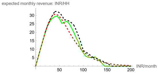 Next, to obtain more realistic estimates of the revenues that the municipalities might expect from a surcharge for recycled water, we assumed that households would not pay the surcharge or a part of it if the amount demanded by the municipality exceeded their willingness to pay, but that they would pay otherwise. Consequently, given the cumulative distribution function for the willingness to pay, CDF, if the municipality requests a surcharge, t, from the households, then the expected revenue of the municipality per household will be t⋅(1 − CDF(t)). What is the optimal surcharge, t, that maximizes the expected revenue per household? Figure 2 plots the expected revenues for the three considered cumulative distributions of WTP. For the green line, the plot shows a peak of 29.5 INR/household for a surcharge of t = 44.7 INR/month; for the red line, the peak is 30.7 INR/household for t = 41.5; and for the black line, it is 32.3 INR/household for t = 43.1 INR/month. Thus, the optimal surcharge was estimated to be in the range of 42 to 45 INR/month with an expected revenue of about 30 INR/household.