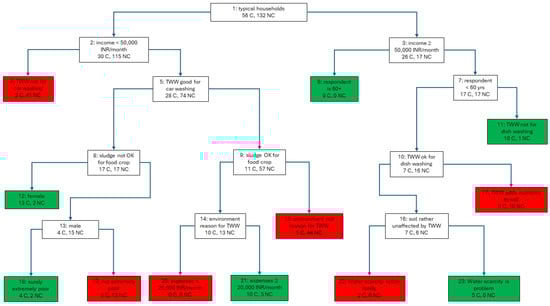 The ten respondents of the red node no. 17 from better-off households agreed to the statement that irrigating with TWW would add nutrients to the soil. The question about adding nutrients to the soil may have puzzled respondents, as treated sludge may be used as a fertilizer, while wastewater treatment ought to remove nutrients from the TWW. However, recent literature [24] has shown benefits to the soil from irrigating with TWW. Respondents had in general favorable views about recycling and would accept and pay for dual taps. However, they did not pay the charge for potable water. Perhaps they were dissatisfied with water quality, as all, except two, used advanced purification with stated maintenance costs of 500–2000 INR/year.