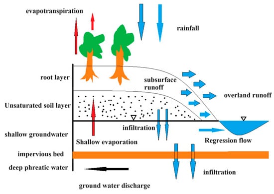 Based on the calculation principle of groundwater balance [30], the calculation formula for shallow aquifer reservoir variables is as follows: