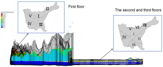 Study area parameter partition map. (The Roman numerals in the figure are the partition number of the permeability coefficient).