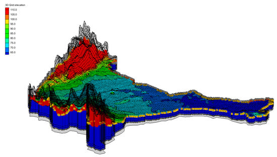The groundwater simulation range option aligns with the SWAT model. The shallow aquifers in the studied area consist predominantly of Quaternary Holocene sand and gravel, with a thickness ranging from 100 to 200 m in most regions. The riverbed and floodplain of the Songhua River’s main stream and its tributaries are predominantly constituted of Holocene (Q4) deposits, specifically a thin layer of yellow clay and sub-clay, together with sand and gravel in the lower section of the basin. The terrace of the interriver zone in the basin primarily consists of Upper Pleistocene (Q3) yellow-brown sand and gravel, with discontinuous sub-clay overlaying it. The flat region corresponds to the Middle Pleistocene (Q2), characterized by gray-brown, gray-black silty sand, sand, and sand gravel, with the lower section interspersed with sub-clay and silty sub-clay. The basin’s base consists of Lower Pleistocene (Q1) deposits, characterized by yellow-green and gray-green medium sand, fine sand, silty sand, and sand gravel. Consequently, the characteristics of the research region were delineated based on the aforementioned fundamental lithology, as illustrated in Figure 3, with the specific values presented in Table 7. The model’s roof elevation was derived from the interpolation of 30 m precision DEM elevation data, while the upper floor was determined using the aquifer thickness indicated by borehole and pumping well data, supplemented by the approximate aquifer thickness documented in the hydrogeological data for the study area. Figure 4 illustrates a schematic representation of the elevation points at the top and bottom inside the study region.