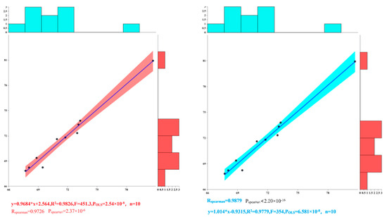 The SWAT model has numerous parameters, and since the middle and lower portions of the Songhua River basin are situated in a cold temperate zone, parameters exhibiting a high correlation sensitivity coefficient were chosen for model adjustment. Twenty-two parameters were selected, and their sensitivity was assessed using SWAT-CUP(Version of SWAT-CUP software used: 5.2.1.1) software. This study employed a global sensitivity analysis. The t-test and p-value significance test were employed to assess the sensitivity of the parameters. Following the establishment of the parameters and the selection of their initial range, 500 iterative computations were executed utilizing the SU-F2 sampling technique integrated into the model [32]. The determination coefficient (R2) and Nash efficiency coefficient (NS) were employed to assess the model’s adequacy. The ideal parameters are presented in Table 8.