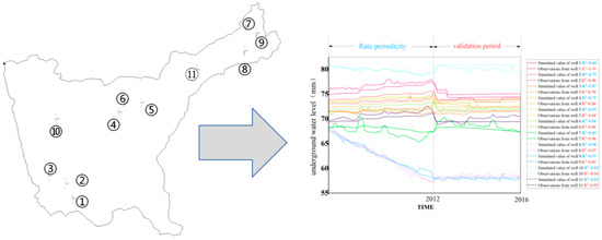 Figure 8 illustrates a schematic representation of all observed well simulations during the training and verification intervals. The graphic illustrates that the model’s outcomes during the training and verification periods align closely with the measured findings. This publication selected a total of 11 observation wells in the study region. Figure 9 illustrates a comparative diagram of simulated and observed water levels for a single well during the training and verification phases. The disparity between the actual water level and the simulated water level is within 0.6 m, satisfying the fundamental criteria for scientific research and providing a more accurate representation of the conditions in the study area.