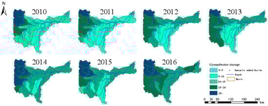 Annual mean water storage of phreatic beds in the sub-basin from 2010 to 2016 (unit: ×108 m3).