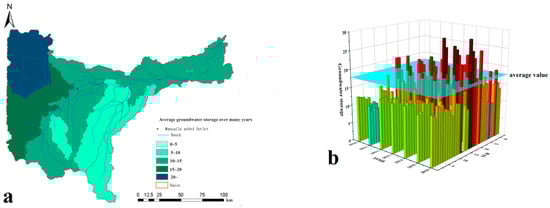 Variation map of water storage in a shallow aquifer in a sub-watershed. (a) shows the geographical distribution characteristics of the average annual water storage in the shallow aquifer, while (b) illustrates a schematic diagram of the changes in average annual water storage in the shallow aquifer. Unit: 108 m3).