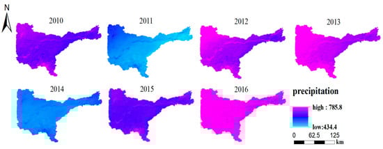 Distribution trend of precipitation in the middle and lower reaches of Songhua River from 2008 to 2016 (Unit: mm).