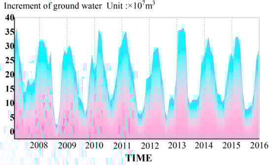 This work employed the MODFLOW model to simulate groundwater recharge, and the validity of the research findings was substantiated through comparison with the simulation results of the SWAT model. This work delineated the research area into a water equilibrium zone characterized by an annual equilibrium period. Figure 13 below shows trends in groundwater recharge from 2008 to 2016. The annual groundwater recharge is as follows: 24.06 × 108 m3, 24.33 × 108 m3, 21.80 × 108 m3, 24.33 × 108 m3, 22.04 × 108 m3, 30.11 × 108 m3, 30.79 × 108 m3, 25.15 × 108 m3, and 32.25 × 108 m3, respectively. The simulation outcomes resemble those of the SWAT model.