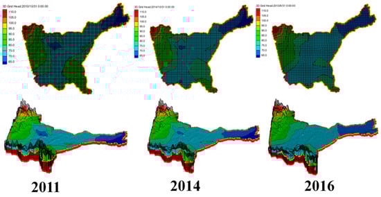 Figure 14 illustrates the distinctive trend of yearly mean groundwater level changes predicted by the MODFLOW model. The figure illustrates that the groundwater level distribution trend diminishes progressively from the northwest to the east and from the south to the north, with the water level fluctuations aligning closely with the groundwater storage variations simulated by the SWAT model. The mean depth of the groundwater level over several years is 8.15 m.