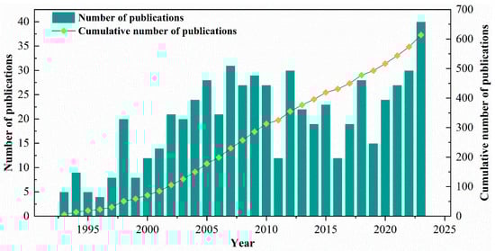 A general analysis of the annual publication trends was conducted based on the 614 articles, and the data were plotted using Origin software (version 2021) to gain an initial understanding of the overall trends in the DNAPL modeling research. The publishing countries, institutions, journals, and keywords over the past 30 years (1993–2023) were then statistically analyzed and mapped using CiteSpace 6.3.R1 [] as the primary tool for bibliometric analysis.