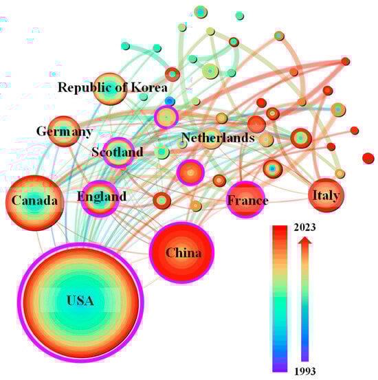 The national collaboration network reveals the importance of individual countries and the interconnections between multiple countries in a specific research field. The co-citation network of collaborative countries (Figure 2), based on the WoS Core Collection data, revealed that 48 countries have published research on groundwater DNAPL contamination modeling. The countries with 10 or more publications are listed in Table 1.