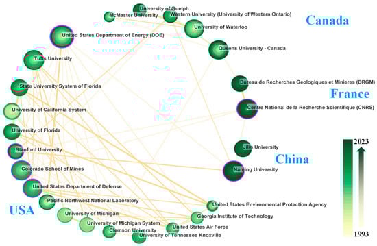A total of 365 institutions have published research related to DNAPL models according to the analysis of the selected publications. The top 25 institutions with more than 10 publications were selected to create a co-citation network map (Figure 3) for visual analysis.