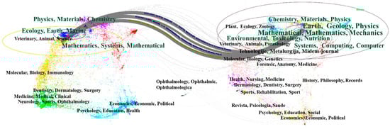 Knowledge map of periodical double graph superposition for WoS publications from 1993 to 2023 (The left area represents the citing journal clusters of knowledge frontiers, while the right area represents the cited journal clusters of knowledge foundations. The curves represent the citation paths, with their thickness indicating the frequency and intensity of the knowledge flow between journals. The size of the ellipses reflects each journal’s publication volume and author count. More papers lengthen the vertical axis, while more authors lengthen the horizontal axis).