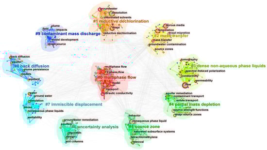 The DNAPL model framework can be broadly divided into three parts: multiphase flow models, mass transfer models, and dissolved phase transport models. These models can be integrated with experimental findings to clarify the migration of DNAPLs in groundwater and predict the contamination distribution, aiding site remediation efforts. To understand the research status in DNAPL contamination modeling better, a keyword co-occurrence analysis was conducted, followed by clustering using the log-likelihood ratio (LLR) algorithm [] to reveal current research hotspots. The keyword clustering yielded a Q value of 0.4169 and an S value of 0.7499 (Q > 0.3 indicates a significant structure; S ≥ 0.7 indicates full reliability). The 10 clusters related to the DNAPL models (Figure 5) highlight 5 prominent keywords each and exhibit the interconnections between clusters.