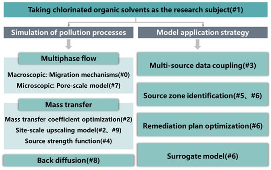 Cluster 1 (#1 reductive dichlorination): On the one hand, researchers focus on chlorinated organic solvents to enhance reductive dechlorination techniques. F. Fagerlund et al. [] used experiments and modeling to study the coupled process of PCE dissolution and dechlorination by nanoscale zero-valent iron in DNAPL source zones. On the other hand, given the common occurrence of PCE and TCE contamination sites, most studies focus on simulating and predicting these pollutants [,,].