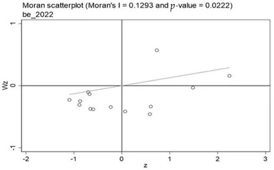 To assess local spatial correlation in terms of the degree of coordination, a Moran scatter plot is constructed via the local spatial autocorrelation model. In the Moran scatter plot, each data point corresponds to a spatial unit, and the points are categorized into one of four quadrants on the basis of the relative magnitude of the unit’s value and that of its neighboring units. These quadrants represent different spatial autocorrelation patterns: