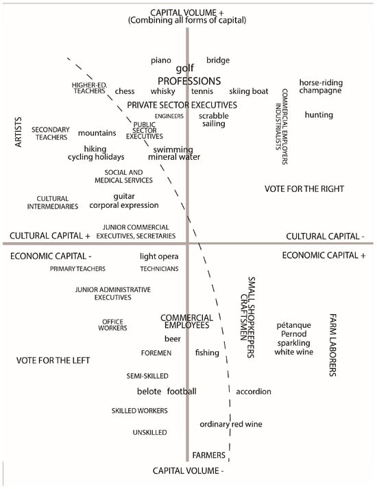 Bourdieu’s work emphasizes understanding how social positions, dispositions, and choices are relationally defined by individuals’ practices within a system. He argues that direct comparisons of isolated traits can misrepresent structural differences or similarities; therefore, comparisons should be made across entire systems. The idea of “distinction” refers to the relational properties that exist through connections to other properties rather than innate qualities [103]. This highlights the concept of social space, where positions are defined by their relations to others, reflecting proximity, distance, and hierarchy. The social space is organized so that agents or groups are distributed according to their positions in the statistical distributions of economic and cultural capital. Agents have more in common when they are closer in these dimensions. The distances on paper reflect social distances. In the main dimension, those with significant capital, such as entrepreneurs and professors, oppose those without, such as unskilled workers. The structure of capital, meaning the relative weight of economic and cultural capital, also creates opposition, such as between professors and entrepreneurs. These capital differences lead to variations in dispositions and positions, translating into different practices and goods, which form a coherent system of habitus according to the social class position (Figure 2). Elaborating on the social space, which is an abstract reality that structures the practices and representations of social agents, enables the construction of theoretical classes based on the primary factors shaping social practices. This classification not only describes empirical realities but, akin to an effective taxonomic system, also forecasts other properties, clustering similar agents and distinguishing them from others.