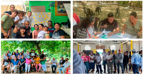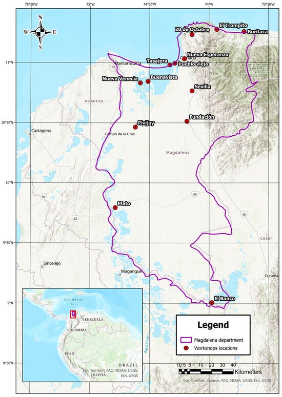 This paper builds the social space for water management in the department of Magdalena, Colombia (Figure 3), which is experiencing water scarcity. To gather local insights into water management challenges, the study conducted a series of interviews, surveys, and workshops across the region, engaging a wide range of stakeholders (Figure 4). These engagements took place in five urban areas: Pivijay, Plato, Pueblo Viejo, Fundación, and El Banco; three rural areas of Santa Marta: El Trompito, Buritaca, and 20 de Octubre; one rural area of Pueblo Viejo: Tasajera; one rural area of Ciénaga: Nueva Esperanza; one rural area of Zona Bananera: Sevilla; and the stilt towns of Buenavista and Nueva Venecia. These interactions provided valuable perspectives from diverse stakeholders across the region.