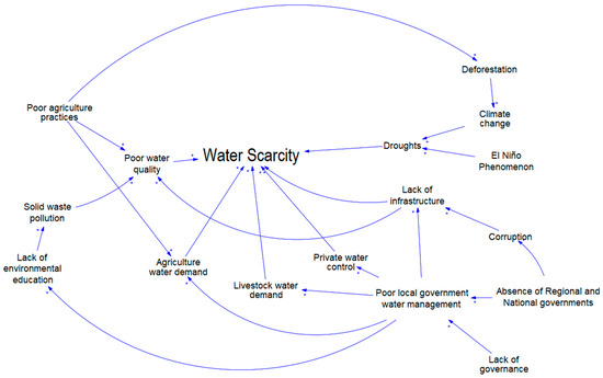 The process included the creation of causal loop diagrams (CLDs) called “Water Scarcity”, which was used as a tool to identify the relationships between the variables affecting water scarcity in Magdalena department, Colombia [120]. This approach allowed the participants to visualize how different factors, such as climate, infrastructure, and water usage, interact with the issue, as well as identify the power relationships between the actors involved in water management in the territory [121].