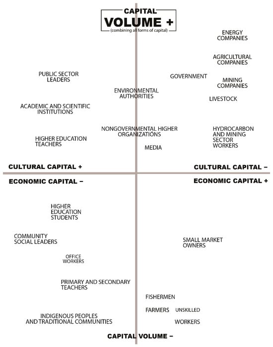In the upper right quadrant (high economic capital and low cultural capital), there are energy, agricultural, and mining companies that have significant control over resources due to their economic power but possess less cultural capital. In the upper left quadrant (high cultural capital and low economic capital), public sector leaders and academic and scientific institutions stand out, having a high level of knowledge but less direct economic influence. In the lower left quadrant (low economic and high cultural capital), actors such as Indigenous Peoples and traditional communities are positioned, having limited access to economic resources but a high level of local and cultural knowledge. In the lower right quadrant (low cultural and high economic capital), small market owners and unskilled workers are found, having limited access to both technical knowledge and economic resources.