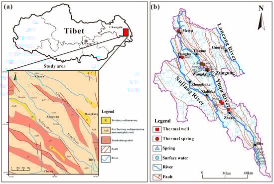 The Tibet geothermal zone is an important geothermal resource-rich area in China. In the 1970s, over 600 hydrothermal active areas were discovered in Tibet during the first comprehensive scientific expedition to the Qinghai–Tibet Plateau. These areas have great potential for the utilization of geothermal resources. Since then, many scholars have studied the geothermal resources in Tibet from various aspects, including their geological setting, hydrogeochemistry, and fluid isotopic characteristics [5,6,7,8,9,10]. Currently, there is a lack of systematic research on the medium-low temperature geothermal resources in the Tibet area. Furthermore, the understanding of the formation mechanism and heat source types of geothermal resources in this area is not deep enough. Zuogong County, located in southeastern Tibet, experiences intense geothermal activity, with over 10 medium-low temperature hot springs such as Wuya and Boko. Conducting a study on the hydrogeochemical characteristics of geothermal resources in Zuogong could provide us with a better understanding of the formation process of medium-low temperature geothermal resources in eastern Tibet.