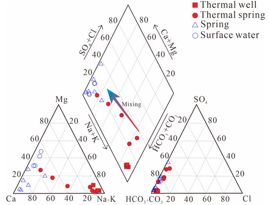 The geothermal water contained HCO3 and HCO3·SO4 water, and the difference in hydrochemical types was primarily reflected in the cation content. The thermal well water had a hydrochemical type of HCO3-Na, while thermal spring water differed slightly. Samples WSDR and DBJB2 belonged to HCO3-Na and HCO3-Ca·Na type water, respectively. As the amount of SO42− in the water increased, the hydrochemical types of DRZG3, DRBX2, and DRCD3 were converted to HCO3·SO4-Na, HCO3·SO4-Ca·Mg, and HCO3·SO4-Na·Ca types (Figure 2). The primary cations in thermal springs change from Na+ to Ca2+, which is thought to be related to the mixing ratio of hot spring water and non-geothermal water. The greater the amount of non-geothermal water mixed in, the higher the concentration of Ca2+ in the thermal spring. Non-geothermal water was HCO3 water, except for KSQ6. The hydrochemical type of spring water was mostly HCO3-Ca type, while that of ZGQ1 and KSQ6 was HCO3-Ca·Na and HCO3·SO4-Ca·Mg type, respectively. The surface water contained mostly HCO3-Ca·Mg and HCO3-Mg·Ca hydrochemical types.