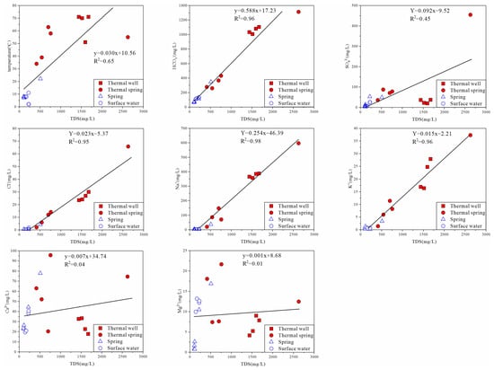 Typically, water samples’ TDS content is mainly influenced by water–rock interactions during the water circulation. For geothermal and non-geothermal water, there was a good positive linear correlation between TDS content and sampling temperature and between HCO3, Cl, Na+, and K+ contents (Figure 3). This indicates that the dissolution of siliciclastic minerals at high temperatures may be an important source of the chemical constitution of geothermal water (4,5). However, TDS had a weak positive correlation with SO42−, Ca2+, and Mg2+ contents. The SO42−, Ca2+, and Mg2+ contents in thermal well water were even lower than those in non-geothermal water. This may be caused by fluid decompression and cooling during the upwelling process of deep geothermal water. The content of thermal spring water was relatively high, which indicates that the increased contents of SO42−, Ca2+, and Mg2+ may be controlled by the dissolution of sulfate minerals such as gypsum in the shallow parts of the earth’s surface. From large to small, the TDS contents of geothermal and non-geothermal water were thermal well water, spring water, and non-geothermal water. This indicates that deep thermal water may have a mixed effect with shallow non-geothermal water during the upwelling process.