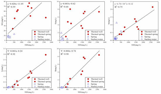There was a positive correlation between the TDS content in non-geothermal and geothermal water and the typical geothermal components of SiO2, F, Sr, Li, and B (Figure 4). This indicates that the contents of the characteristic components such as SiO2, F, Sr, Li, and B in geothermal water are mainly controlled by water–rock interactions such as mineral dissolution. The R2 between Li and B contents and TDS reached more than 0.9, indicating that Li and B have the same source between geothermal water and non-geothermal water. Water–rock interactions during deep circulation increase Li and B concentrations in geothermal water.