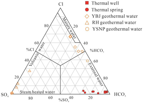 The concentrations of major anions in geothermal water were mainly higher than those in non-geothermal water. The HCO3 content of geothermal water ranged from 277.10 to 1313.00 mg/L (the values of thermal well water and thermal spring water ranged from 1007.00 to 1105.00 mg/L and from 259.50 to 1313.00 mg/L, respectively), and that of non-geothermal water ranged from 63.78 to 346.80 mg/L (the values of spring water and surface water ranged from 63.78 to 346.80 mg/L and from 108.40 to 134.20 mg/L, respectively). The Cl contents of thermal well water and thermal spring water ranged from 23.38 to 29.97 mg/L and from 1.99 to 65.84 mg/L, respectively. In contrast, the Cl contents of spring water and surface water ranged from 0.39 to 4.05 mg/L and from 0.16 to 1.80 mg/L, respectively. The SO42− contents of thermal well water and thermal spring water ranged from 20.30 to 37.12 mg/L and from 35.43 to 454.30 mg/L, respectively. In comparison, the SO42− content of non-geothermal water was between 3.55 and 52.48 mg/L. Geothermal water had a higher SO42− content than thermal well water.