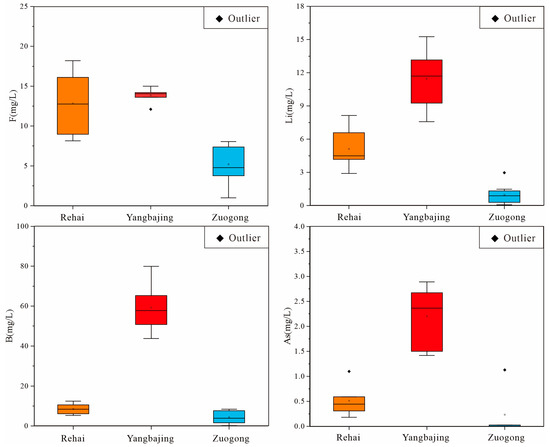 To clarify whether the geothermal water in Zuogong is affected by molten magma, this study used the anion ternary diagram (Cl–SO4–HCO3) to compare the contents of four characteristic elements (Li, B, F, and As) in geothermal water possibly derived from magma with hydrochemical constituents of Tengchong Rehai (RH) in Yunnan, Yangbajing (YBJ) in Tibet, and Yellowstone National Park (YSNP). These locations are known to have clear magma heat sources [36,37,38]. As shown in Figure 5, the geothermal water in the Zuogong area is bicarbonate geothermal water, and water samples are all distributed in the peripheral cycle water area. In terms of the characteristics of the anionic components, Zuogong geothermal water is not affected by the molten magma.