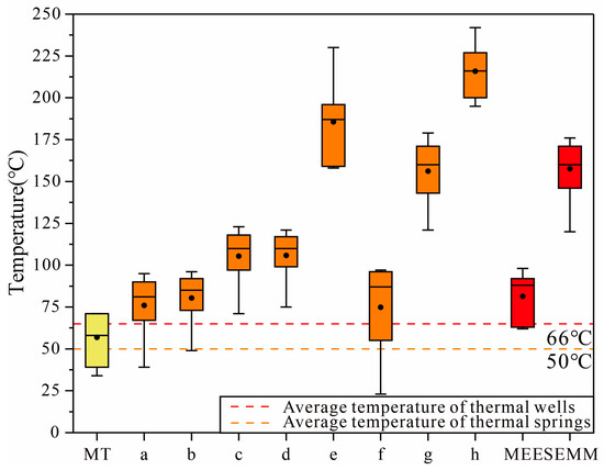 where H denotes the thermal circulation depth, m; t1 denotes the maximum temperature of thermal water in the deep part, °C; t2 denotes the constant temperature zone temperature, °C; h denotes the thickness of the constant temperature zone, m; and I denote the geothermal gradient. Based on the results of previous data collection, t2 = 5 °C, h = 30 m, and I = 3.5 °C/100 m were taken in this study [25].