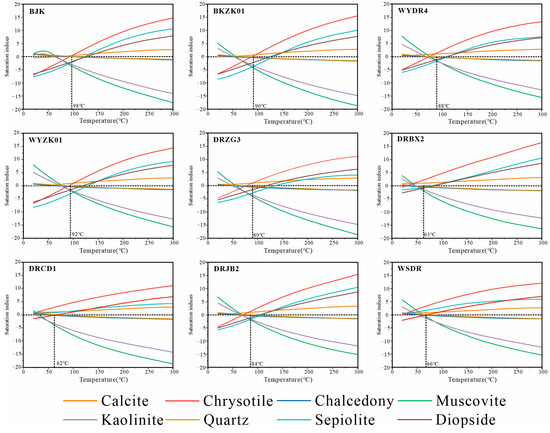 The multi-mineral equilibrium geothermometer is based on the multi-component chemical equilibrium of the geothermal system to simulate the deep reservoir temperature of geothermal fluid. It has been widely used in thermal reservoir temperature estimation [16]. The basic assumption of the multi-mineral equilibrium geothermometer is that there is a chemical equilibrium (or approximate equilibrium) between the deep geothermal fluid and the mineral combination in the reservoir. The equilibrium of multiple minerals may converge to a small temperature range, and the convergence temperature of this range is considered to be the thermal reservoir temperature.